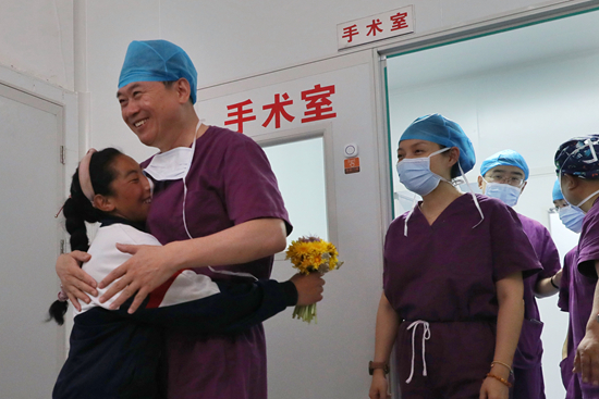 當(dāng)做完14臺(tái)手術(shù)的中國工程院院士、北京清華長庚醫(yī)院院長董家鴻從手術(shù)室走出來,旦正措趕緊上前,與董爺爺擁抱。