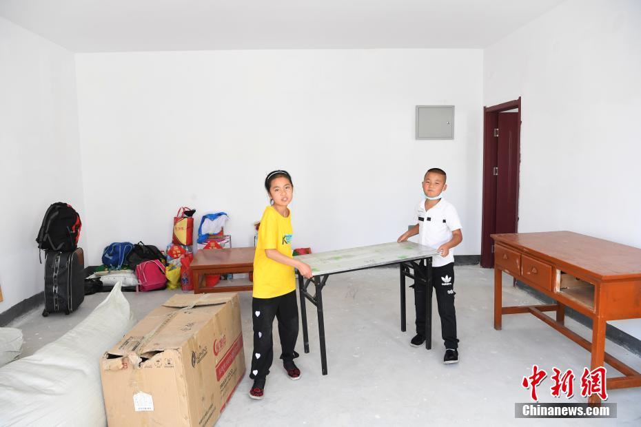8月7日,甘肅省舟曲縣首批60戶289名地質(zhì)災(zāi)害避險(xiǎn)搬遷村民到達(dá)蘭州新區(qū)并入住,11歲小女孩虎紅霞和弟弟在新家內(nèi)整理家具。甘肅舟曲縣啟動(dòng)地質(zhì)災(zāi)害避險(xiǎn)搬遷工作,第一批次60戶289人集中告別故土,乘車前往數(shù)百公里之外的蘭州新區(qū)。 中新社記者 楊艷敏 攝