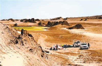 夏令營(yíng)營(yíng)員在戈壁中搭帳露營(yíng)。