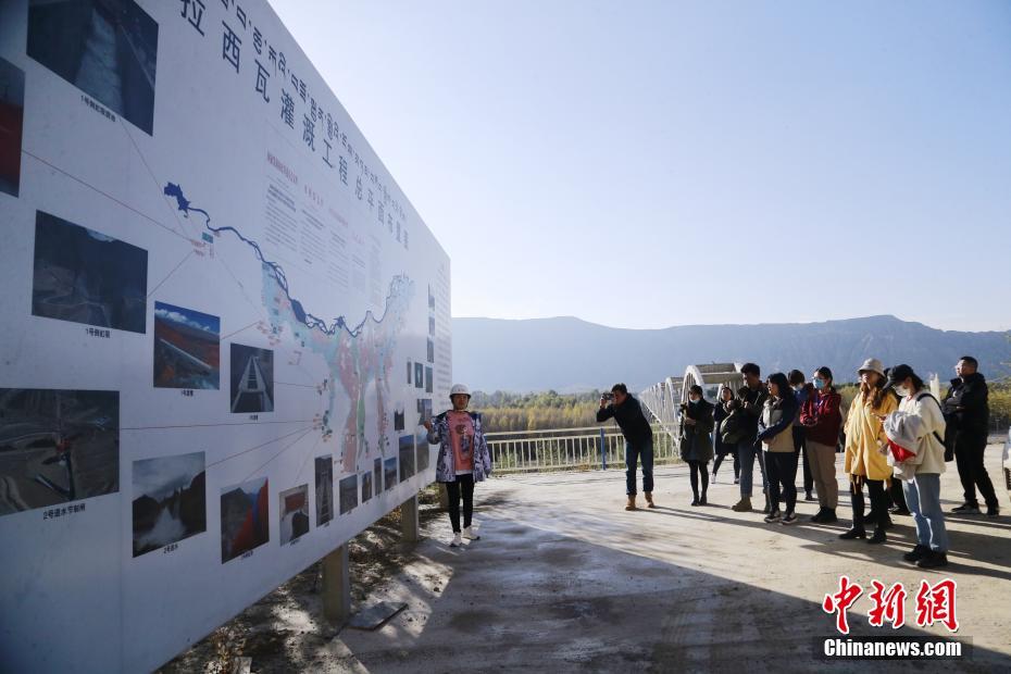 10月16日,青海省海南藏族自治州貴德縣拉西瓦灌溉工程建設(shè)點(diǎn),工作人員向記者介紹該工程項(xiàng)目進(jìn)展。中新社記者 馬銘言 攝