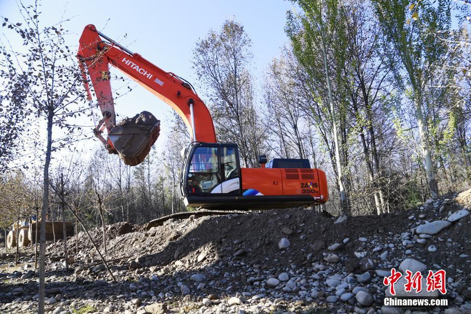 10月16日,青海省海南藏族自治州貴德縣拉西瓦灌溉工程中的一處建設(shè)點(diǎn),工人用挖掘機(jī)施工。中新社記者 馬銘言 攝