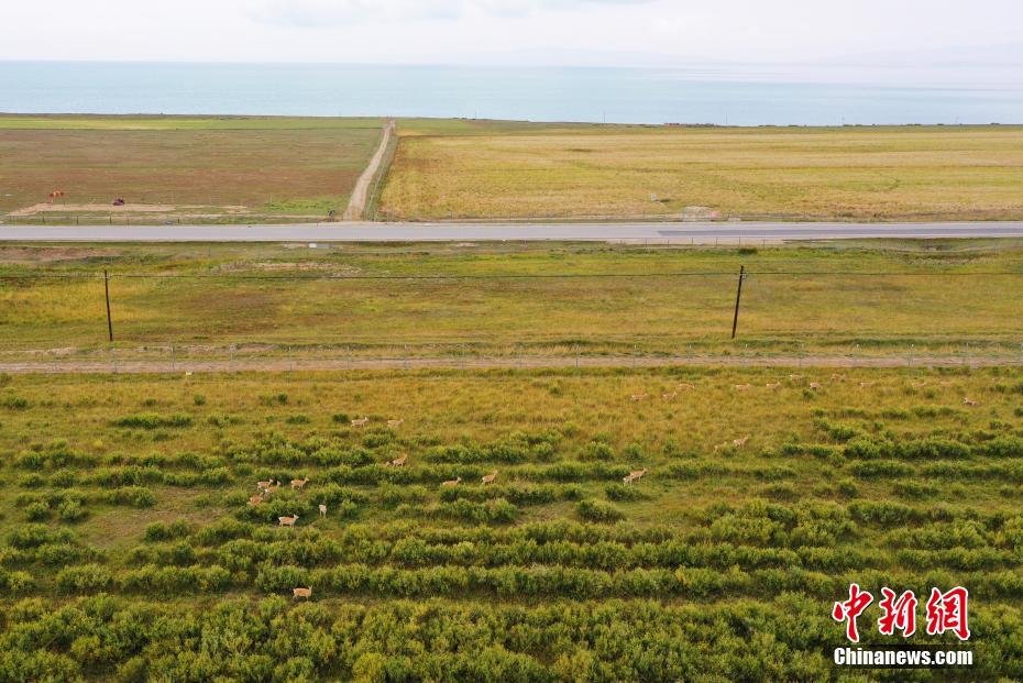 9月27日,在青海省海南藏族自治州共和縣青海湖國家級自然保護區(qū)南岸保護站,普氏原羚在草場內進食。(無人機照片) 中新社記者 馬銘言 攝