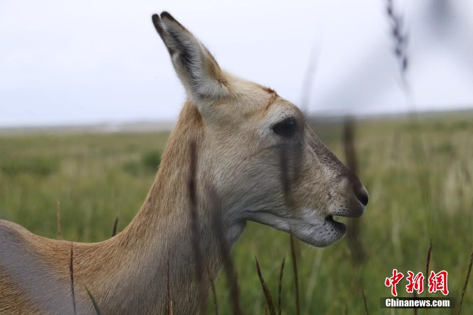 9月27日,在青海省海南藏族自治州共和縣青海湖國家級自然保護區(qū)南岸保護站,普氏原羚在草場內進食。 中新社記者 馬銘言 攝