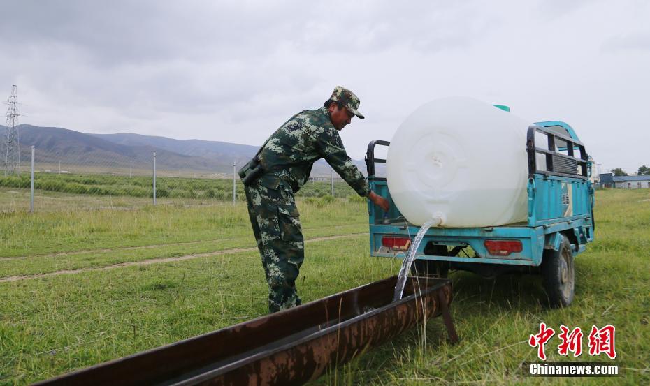 9月27日,在青海省海南藏族自治州共和縣青海湖國家級自然保護區(qū)南岸保護站內,管護員往普氏原羚的水槽內添水。中新社記者 馬銘言 攝