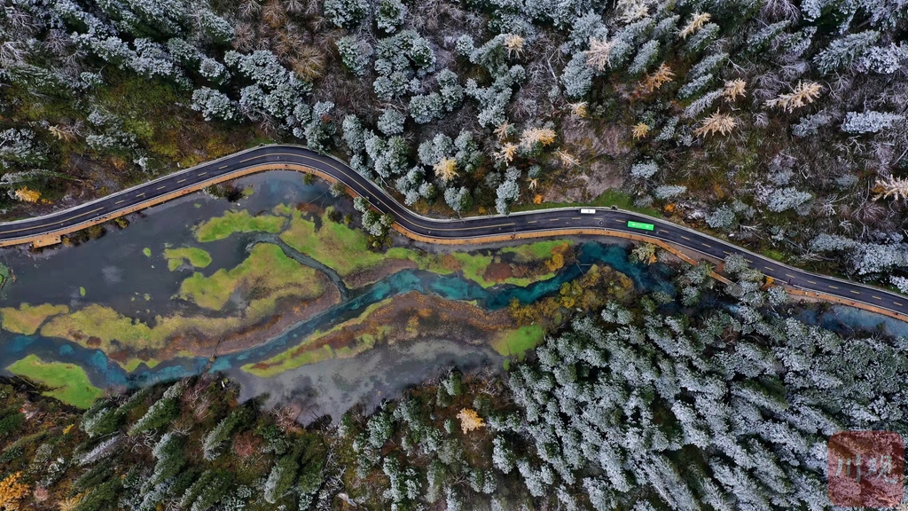 而隨著冷空氣的偶然襲來,九寨溝也披上了一層清透潔白的“雪衣”,形成了雪探彩林的別樣景致。這邊是冰雪和瀑布銀裝,那邊是斑斕彩林倒映在鏡面湖水,真正走進了半山彩林半山雪的童話世界,更浪漫也更具詩情畫意。