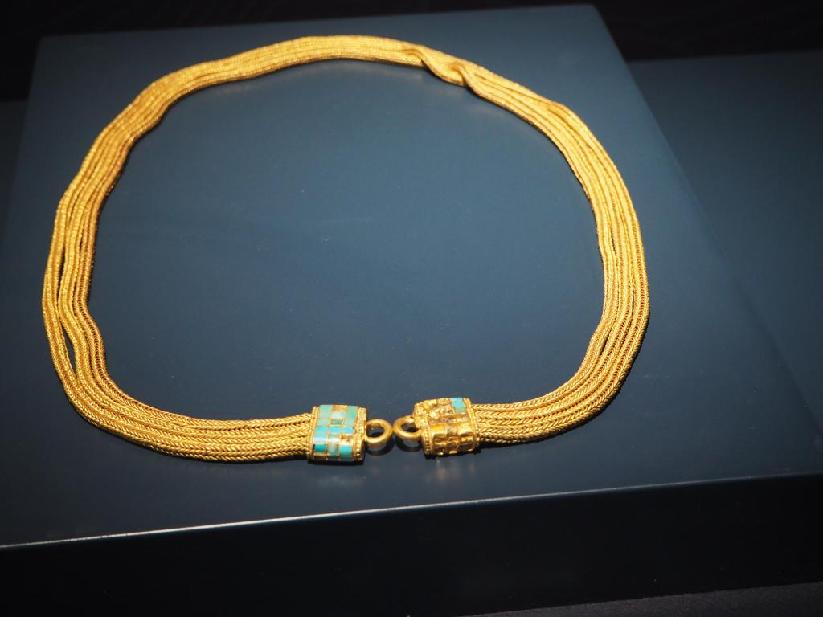 這是11月24日拍攝的出土于2018血渭一號(hào)墓的鑲綠松石金鏈。新華社記者 白瑪央措 攝
