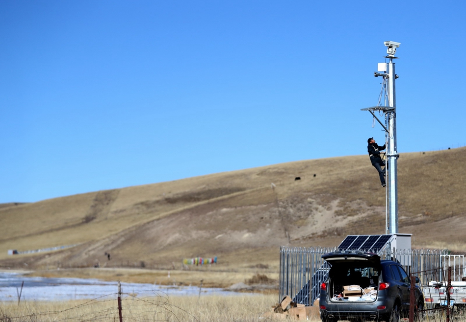 工作人員在尕海湖邊安裝遠程視頻監(jiān)測監(jiān)控。