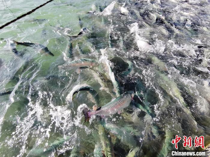 圖為尖扎縣黃河水面養(yǎng)殖網(wǎng)箱里的鮭鱒魚。 張?zhí)砀?攝