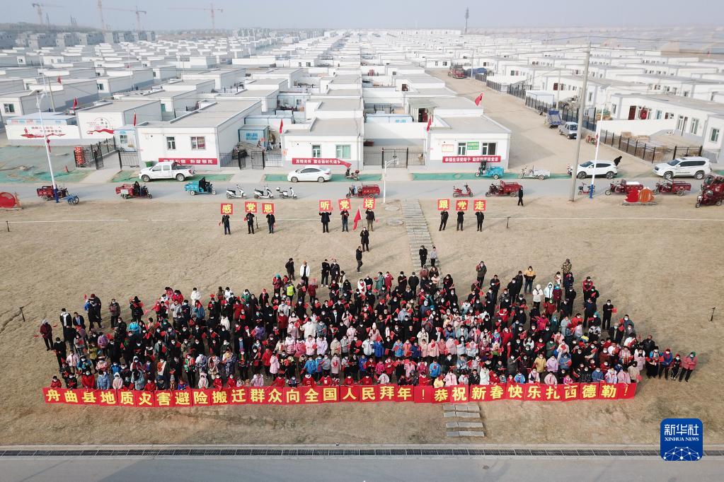 在蘭州新區(qū)舟曲避險(xiǎn)搬遷安置點(diǎn),搬遷群眾向全國人民拜年(1月24日攝,無人機(jī)照片)。新華社記者 范培珅 攝