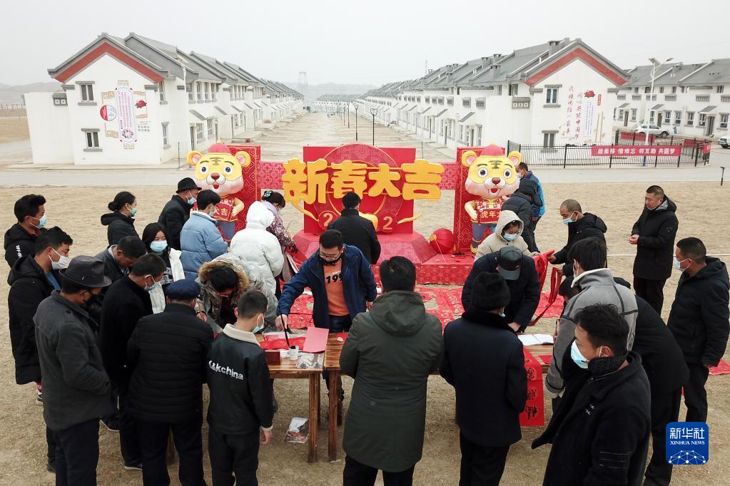 1月25日,在蘭州新區(qū)舟曲避險(xiǎn)搬遷安置點(diǎn),舟曲地質(zhì)災(zāi)害避險(xiǎn)搬遷第一臨時(shí)黨支部組織書法家給搬遷群眾送春聯(lián)(無人機(jī)照片)。新華社記者 范培珅 攝