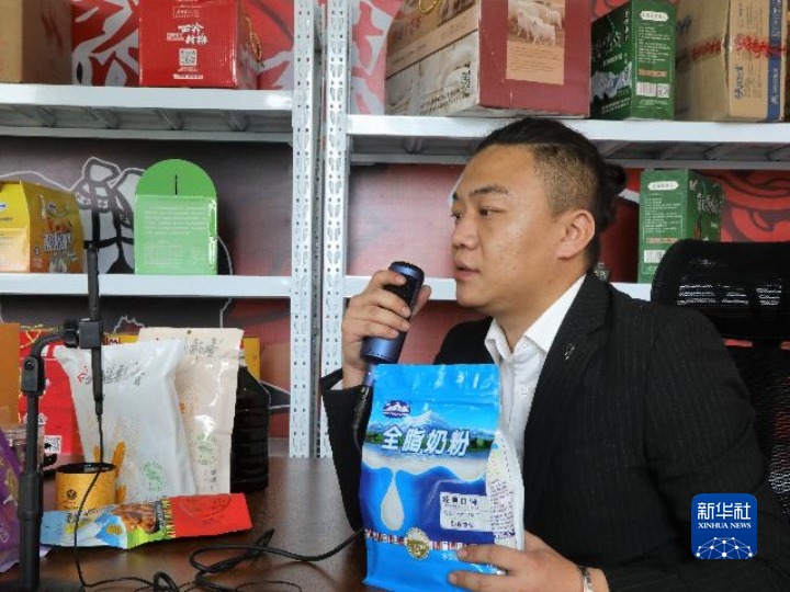 1月25日,網絡主播騰格爾在直播間為粉絲們介紹來自家鄉(xiāng)的農畜產品。新華社 央秀達珍 攝