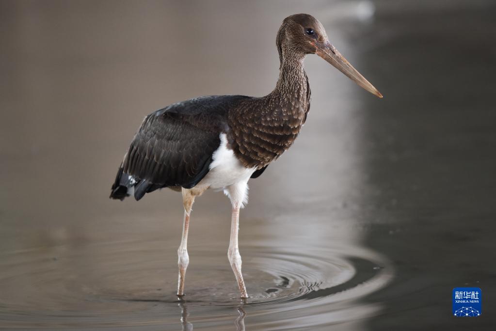 2020年12月6日,一只黑鸛在西寧市北川河濕地公園內覓食。新華社記者 吳剛 攝
