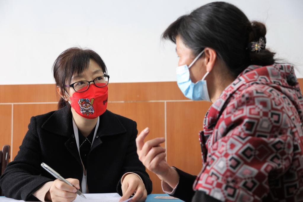 3月9日,評(píng)估機(jī)構(gòu)工作人員袁國(guó)芬(左)在社區(qū)“石榴籽家園”開展老年人能力綜合評(píng)估工作。新華社記者 趙玉和 攝