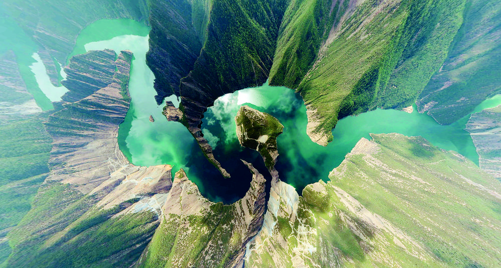 天龍湖是一個(gè)向上的世界,這世界被山水抬舉。記者從最佳視角——位于峽谷核心區(qū)普巴絨鄉(xiāng)比貢寺所在的山脊俯瞰,“九曲回腸”的一灣灣碧水在瘦削相對(duì)的青山之間,串連似珠玉,蘊(yùn)翠含黛、峻峭生姿。