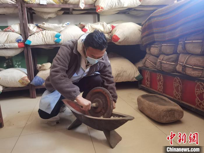 圖為丁增扎西碾制藏藥?!∨擞隄?攝