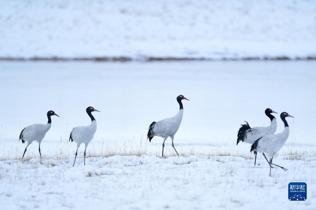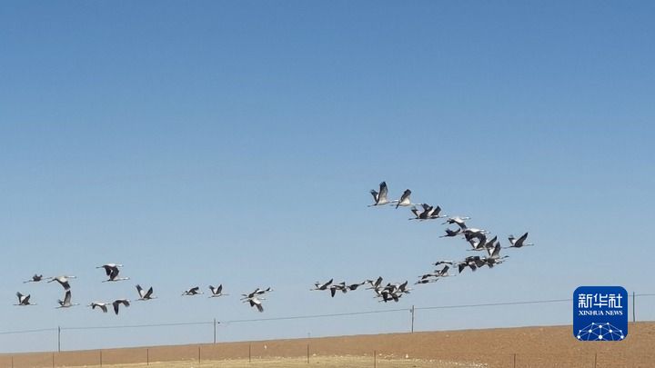 今年3月,青海果洛藏族自治州瑪多縣境內(nèi)的三江源國家公園,蓑羽鶴在飛翔。新華社記者 呂雪莉 攝