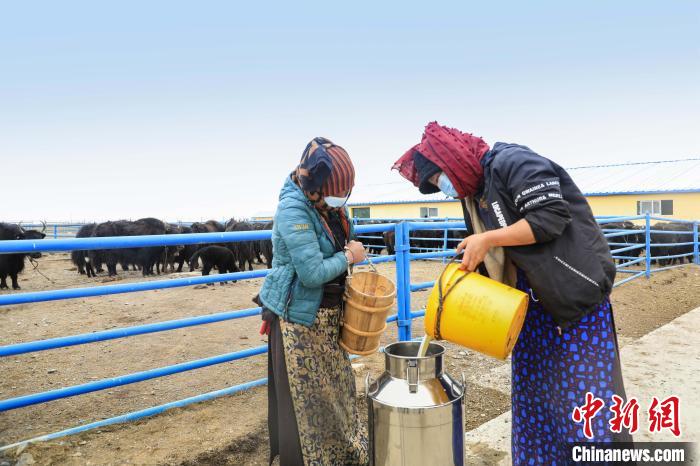 在畜棚外的柵欄里,母牛慵懶地反芻并守護(hù)著蹄下初生的牛犢,絲毫不因人員走動(dòng)而感到驚慌。從牧民變身飼養(yǎng)員的婦女們進(jìn)進(jìn)出出,忙碌著為欄里的牦牛添加飼料。