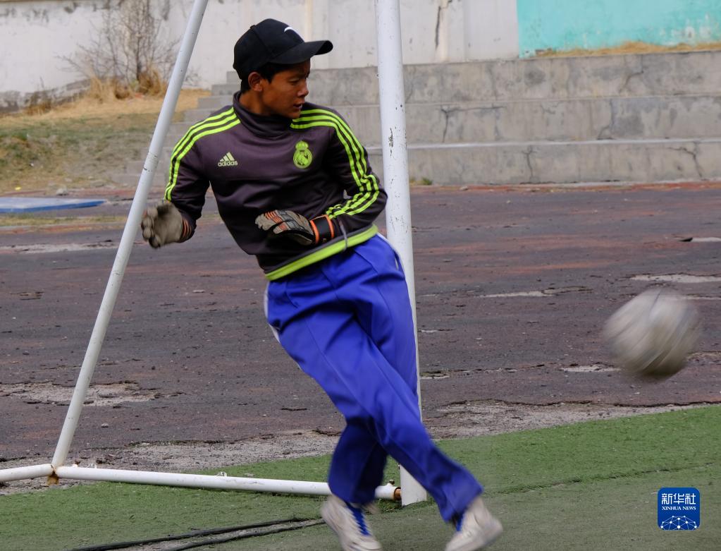 4月18日,稱多縣文樂(lè)中心寄校足球社團(tuán)的學(xué)生在守門。新華社記者 央秀達(dá)珍 攝
