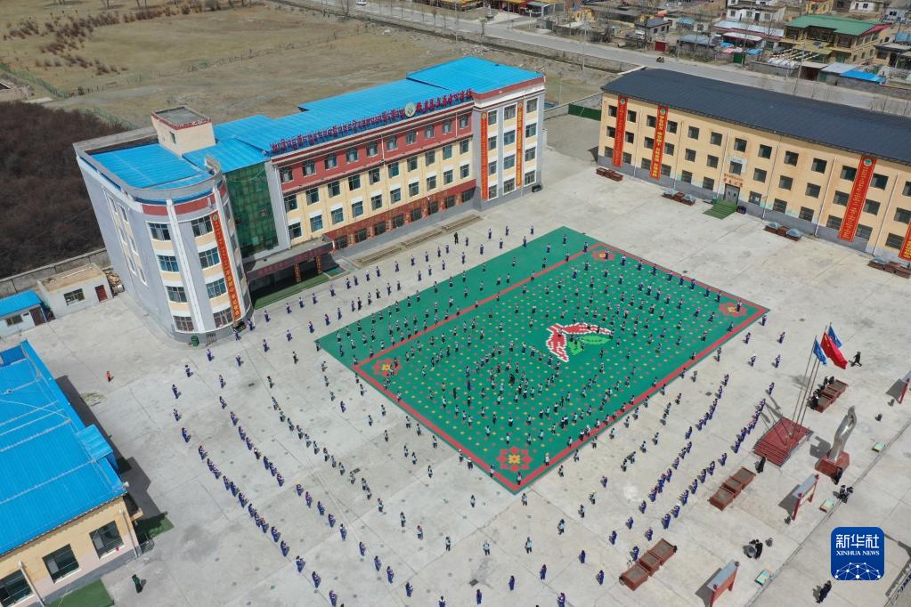 4月18日,稱多縣文樂(lè)中心寄校的學(xué)生們跳操(無(wú)人機(jī)照片)。新華社記者 韓方方 攝