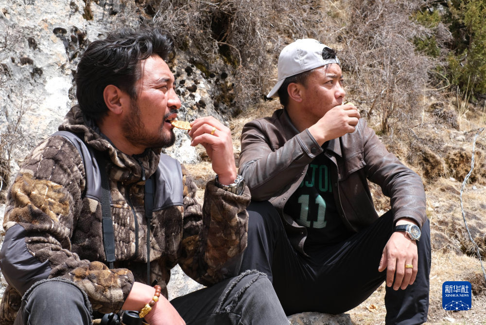 4月22日,生態(tài)管護(hù)員達(dá)杰(左)和尕次在休息。新華社記者 韓方方 攝