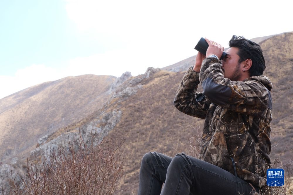 4月22日,生態(tài)管護(hù)員達(dá)杰用望遠(yuǎn)鏡觀察對面山上的野生動物。新華社記者 央秀達(dá)珍 攝