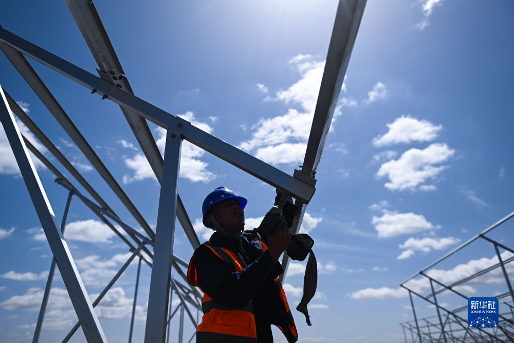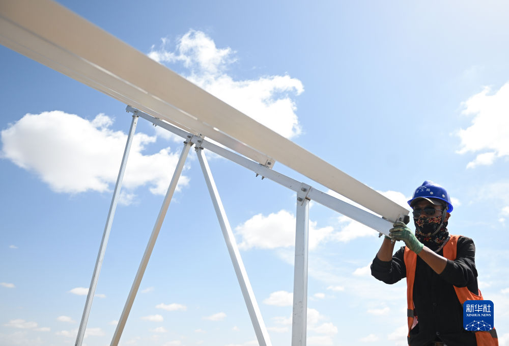 6月8日,工人在黃河上游水電開發(fā)有限責(zé)任公司海南基地共和縣100萬千瓦光伏項目現(xiàn)場施工。新華社記者 駱曉飛 攝
