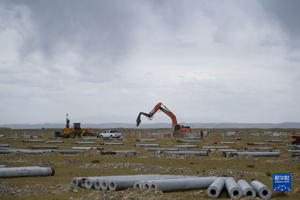 6月8日,工人在國家能源集團海南基地共和縣100萬千瓦牧光儲二期20萬千瓦建設(shè)項目施工。新華社記者 張龍 攝