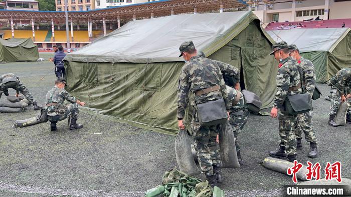 記者10日從四川省阿壩州委宣傳部獲悉,6月10日凌晨,四川阿壩州馬爾康市多次地震發(fā)生后,武警四川總隊阿壩支隊第一時間趕到震區(qū)周邊居民密集區(qū)域,擔負搭建安置點、安撫群眾、巡邏執(zhí)勤等任務(wù)。今天清晨五點,災(zāi)區(qū)又出現(xiàn)降雨天氣,武警官兵們在馬爾康市城區(qū)應(yīng)急避難場所,緊急搭建帳篷。