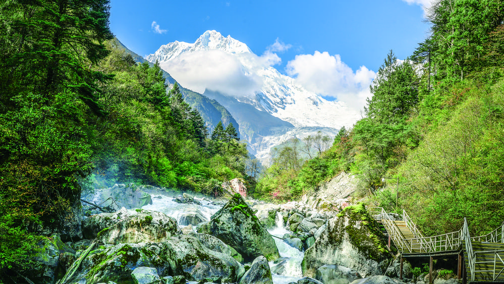 巍峨的雪山、磅礴的冰川、頂級(jí)的溫泉、茂盛的原始森林、縹緲的云霧、奇特的紅石景觀、濃郁的民俗風(fēng)情……初夏時(shí)節(jié),走進(jìn)海螺溝景區(qū),映入眼簾的是“滿目蒼翠一望收,欣欣向榮盛世美”的錦繡景致。