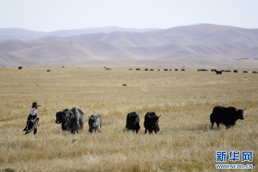 秋日時節(jié),在黃南州澤庫縣寧秀鄉(xiāng),當(dāng)?shù)啬撩裨诓菰戏拍?。新華社記者 張龍 攝