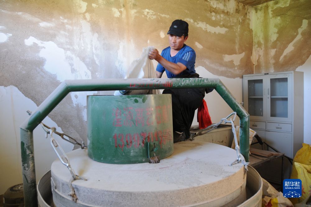 2022年6月16日,日秀瑪村村民角巴才讓正在打磨青稞粉。新華社記者 顧玲 攝