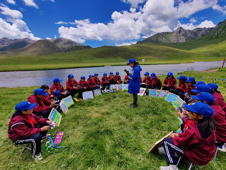 青海洮河源濕地公園管理服務(wù)中心的科普宣教員多杰康卓正在向完全小學(xué)的學(xué)生普及《濕地保護法》,讓大家身處濕地公園內(nèi),更加立體地知道什么是濕地以及保護濕地的意義。