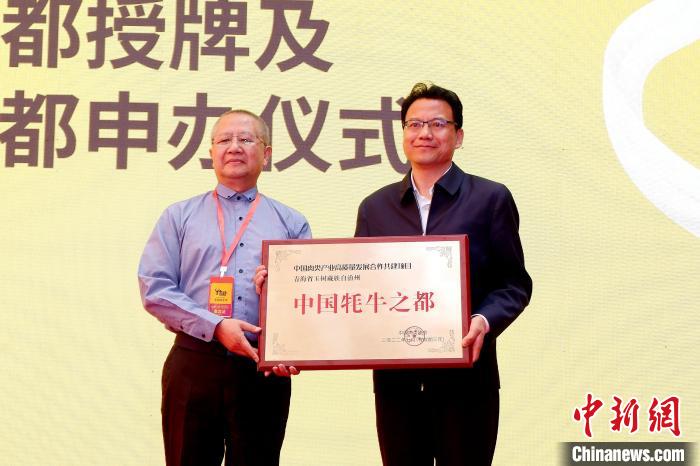 圖為中國肉類協(xié)會副會長高觀(左)為玉樹州授予“中國牦牛之都”稱號。李雋 攝