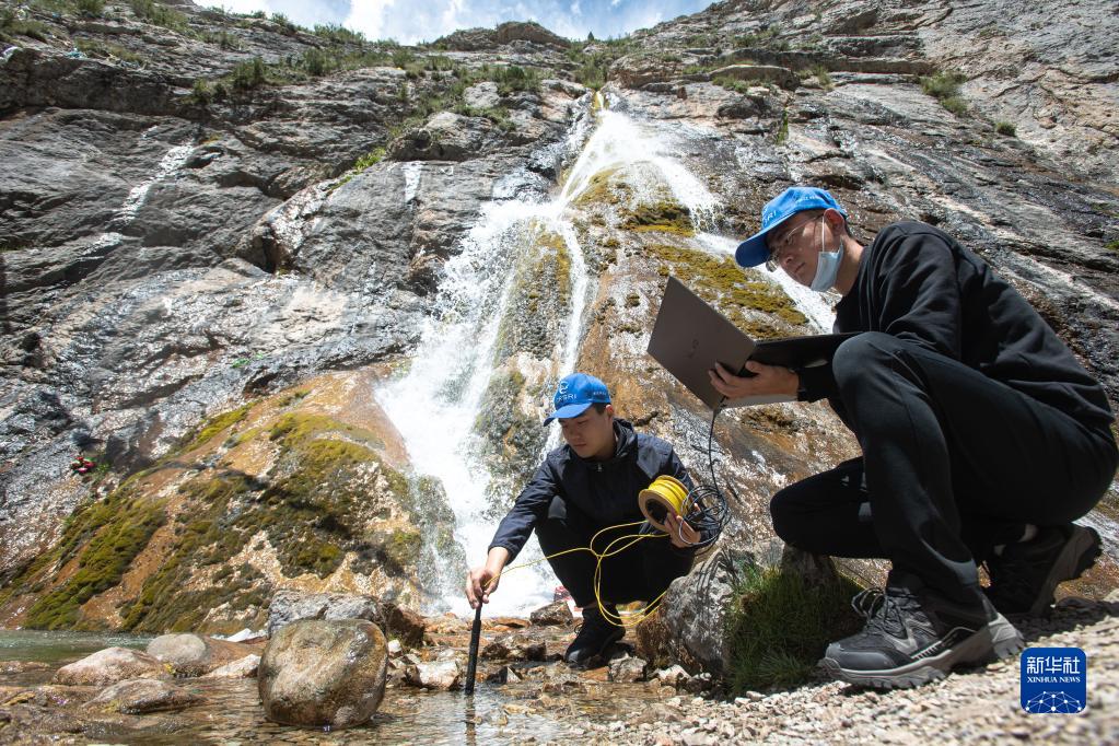 7月24日,長江科學院科考隊員李魯?shù)ぃㄓ遥┡c劉晗在瀾滄江源區(qū)的扎曲進行科考工作?!⌒氯A社記者 肖藝九 攝