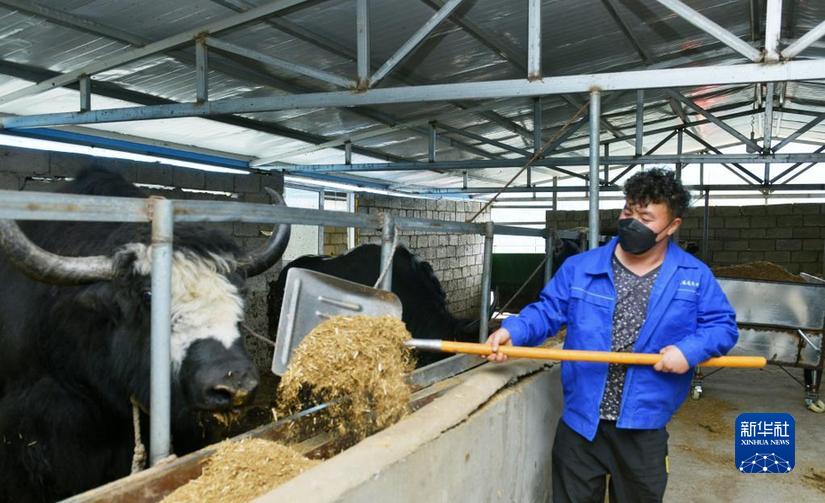 山高云低,在四川省阿壩藏族羌族自治州小金縣美興鎮(zhèn)下馬廠村麻足寨的山頂,村民唐裕龍正給養(yǎng)殖場的牦牛喂飼草、鏟牛糞。