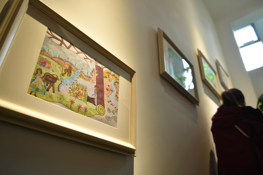 圖為祁連山國(guó)家公園青海片區(qū)展陳中心內(nèi)展出的兒童繪畫作品??▼I梅朵 攝