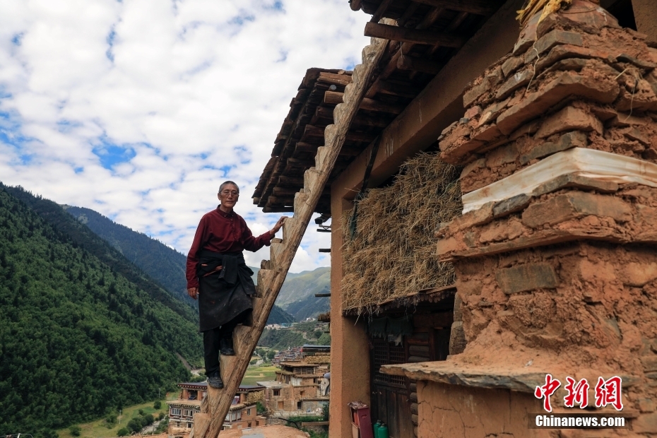 8月17日,日斯?jié)M巴碉房的主人洛吾王爾甲站在木梯上。日斯?jié)M巴碉房坐落于四川省阿壩藏族羌族自治州壤塘縣宗科鄉(xiāng)加斯?jié)M村石波寨,修建于元末明初,距今已有近700年的歷史。碉房共分九層,高25.6米,外型呈階梯狀,是一座保存完好的藏式傳統(tǒng)民居。2006年,日斯?jié)M巴碉房被列為全國(guó)重點(diǎn)文物保護(hù)單位。 中新社記者 王磊 攝