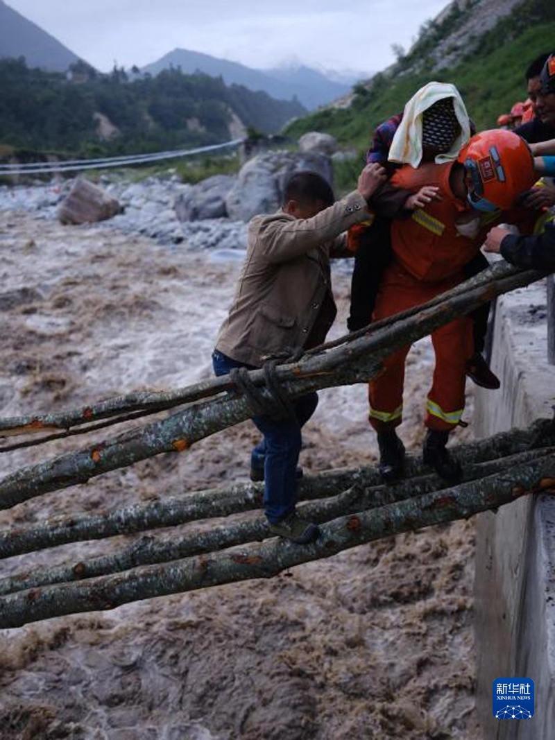 9月5日,四川省森林消防總隊甘孜支隊消防員在瀘定縣磨西鎮(zhèn)青崗坪村轉(zhuǎn)移群眾和傷員。程雪力 攝