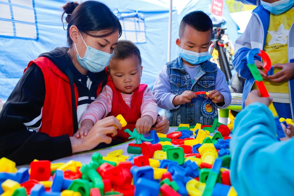 9月7日,在四川省甘孜州瀘定縣磨西鎮(zhèn)地震救災安置點,志愿者陪伴孩子們在青青兒童樂園玩耍。新華社記者 沈伯韓 攝
