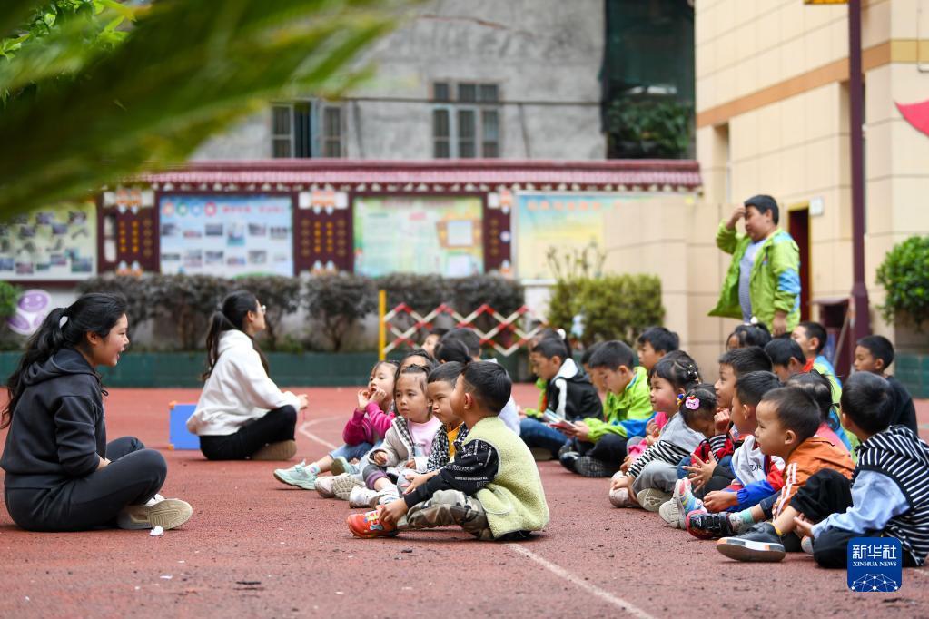 9月7日,在石棉縣草科鄉(xiāng)中心小學(xué)操場上,老師在給附屬幼兒園的小朋友上課。新華社記者 胥冰潔 攝