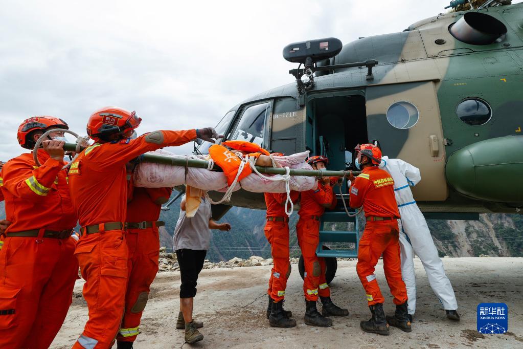 9月6日,救援人員抬著一名從瀘定縣得妥鎮(zhèn)灣東村疏散出來的受傷村民,準(zhǔn)備通過直升機(jī)將其運(yùn)出。新華社記者 沈伯韓 攝