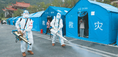 9月6日,武警四川總隊(duì)醫(yī)院醫(yī)護(hù)人員在瀘定縣磨西鎮(zhèn)臨時(shí)安置點(diǎn)開(kāi)展消殺工作。李華時(shí) 攝(人民圖片)