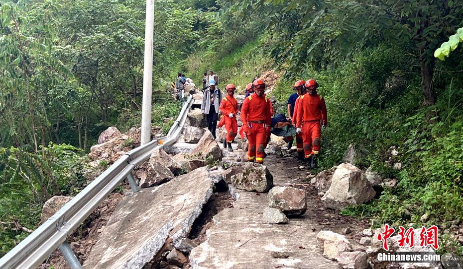 森林消防員抬著傷者通過地震中受損路段轉移。譚昊 攝