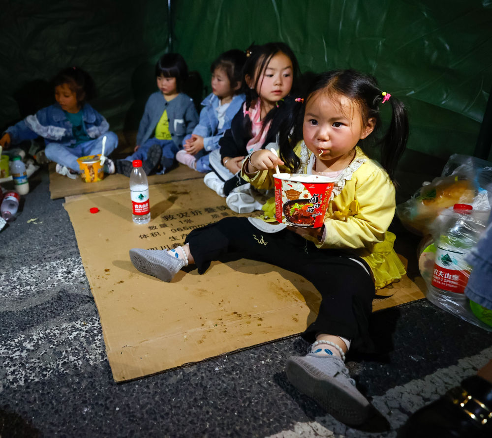 9月5日晚,在磨西鎮(zhèn)的受災(zāi)群眾臨時安置點(diǎn),幾個家庭的孩子們在一個帳篷里吃飯、休息。