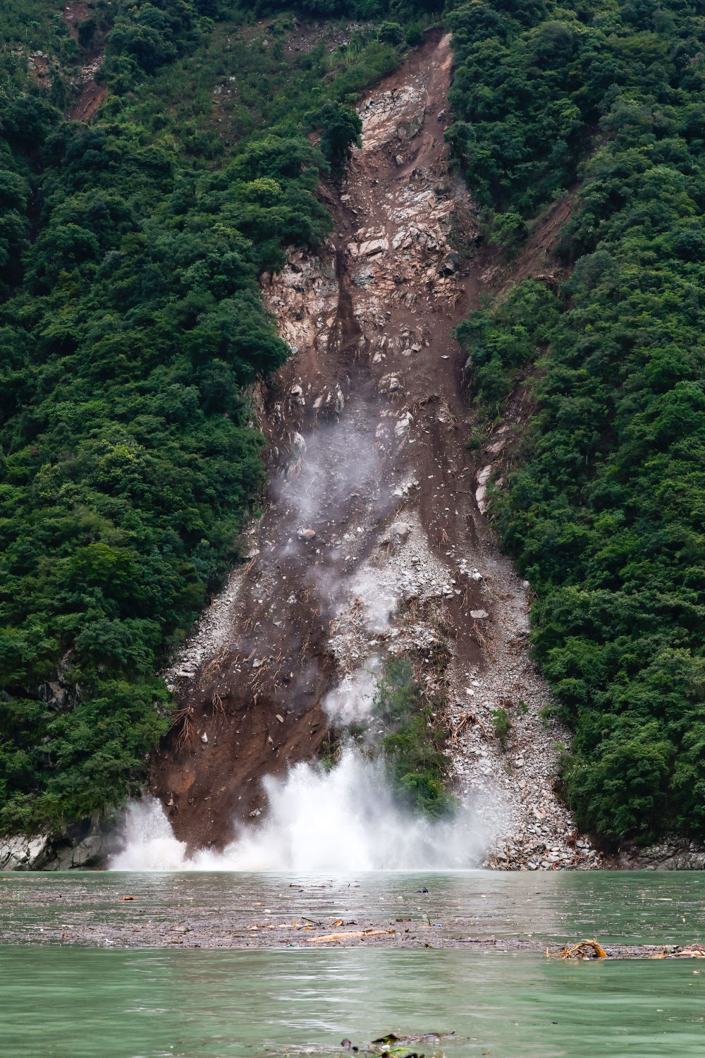 從聯(lián)合村隧道口下到山腳下,是一個臨時碼頭。因?yàn)榈刭|(zhì)、道路等條件所限,救援力量只能從這里乘坐橡皮艇,沿水路行至上圖那個山谷口附近,登陸后沿山路上行,翻過紅花崗再下行才能進(jìn)入灣東村。坐在橡皮艇里,時不時還能看到河畔被地震破壞的山體仍在不停滾下落石,巨大的聲響回蕩在大渡河上空。