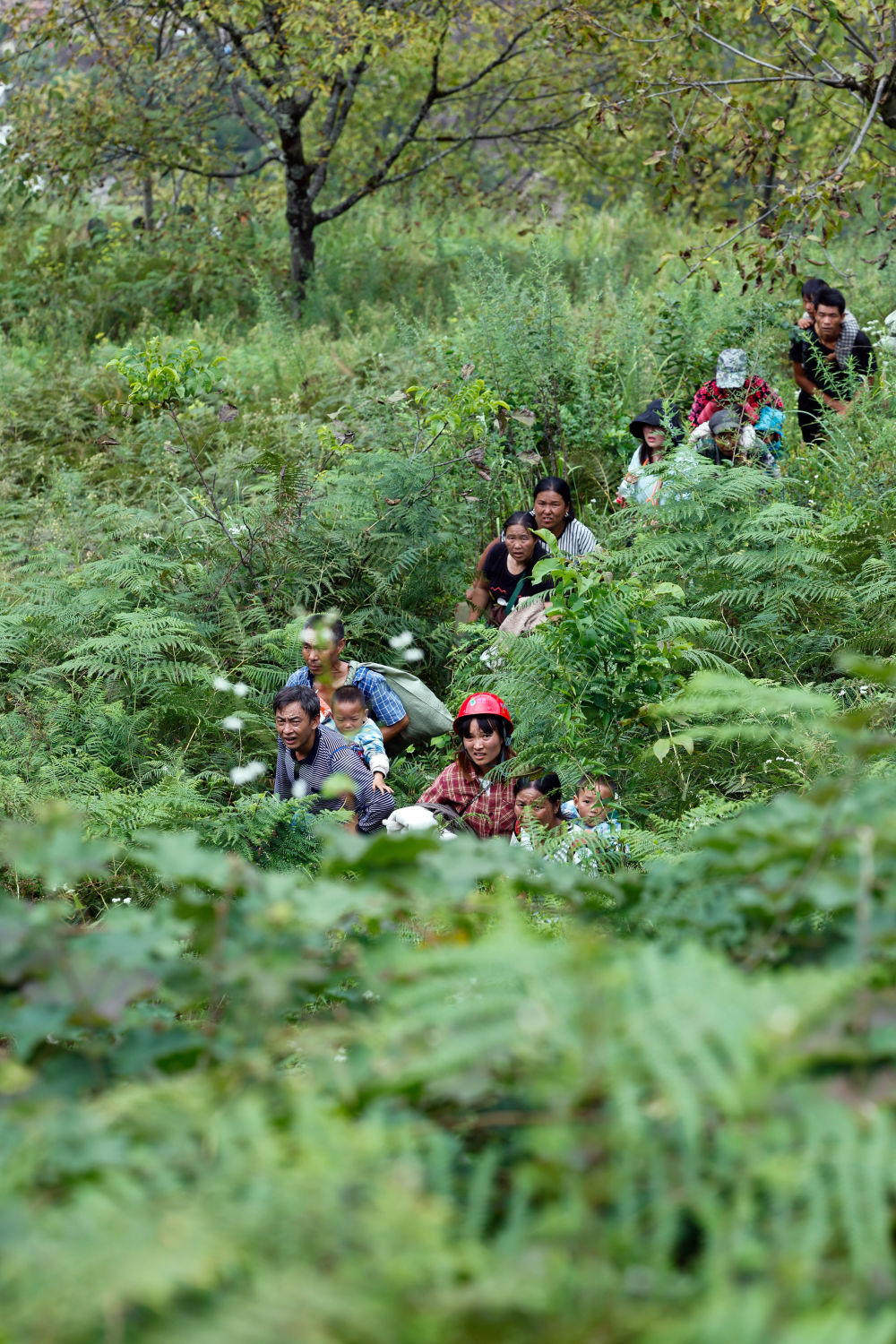 穿越了十余個這樣的路段,遠(yuǎn)遠(yuǎn)看到山下有人影晃動在齊人高的綠色植物之間,再往山上走。向?qū)дf他們是從灣東村一組上來的被困群眾。透過長焦鏡頭看到,一名精壯的小伙子赤裸上身,拿著鐮刀走在最前面為鄉(xiāng)親們開路,鄉(xiāng)親們跟在后頭,有的還背著孩子。幾名救援人員在變形的公路護(hù)欄旁接爬上來的人,一名背著孩子的婦女一握到解放軍戰(zhàn)士的手就哭了出來……待這批村民全部上到公路上后,救援人員護(hù)送他們返回紅花崗附近可以停直升機(jī)的疏散地點(diǎn),然后再去山下接人。