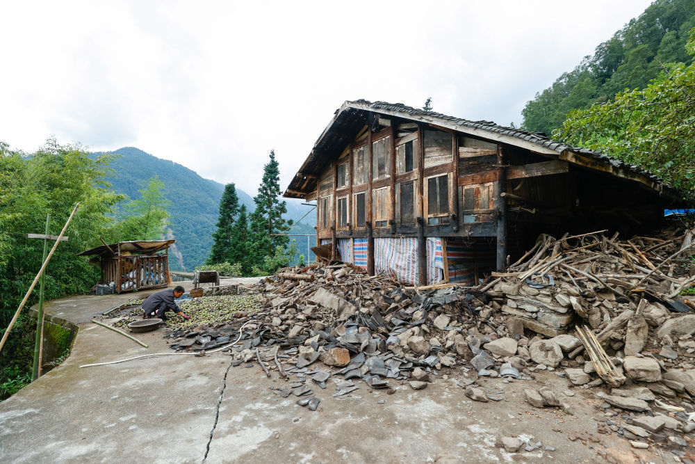 告別陳松林,沿村里的入戶路繼續(xù)往山下走,就到了共和村一組。這里的幾戶民房垮塌得也很厲害。劉芳的丈夫和兒子正在屋頂鋪防雨布。劉芳說,屋里有糧食,天要下雨,別給淋壞了。從房后貓腰小心穿過一片殘垣來到她家前院,院子的一角已垮塌,整個房子墻體裂了巨大的縫,完全無法使用。村里的很多房子都和劉芳家的差不多,據(jù)介紹,共和村一組有78戶,其中77戶的房子都在地震中受損嚴(yán)重?zé)o法使用。劉芳家是共和村一組剩下的最后一家人,下午他們也要轉(zhuǎn)移到位于磨西鎮(zhèn)的集中安置點(diǎn)。