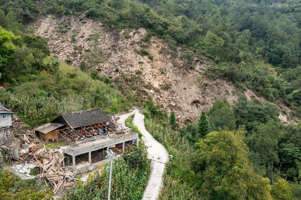 9月8日,共和村一組被地震損壞的民房。旁邊坍塌的山體本是盤山公路,如今已隱入山中不復(fù)存在。