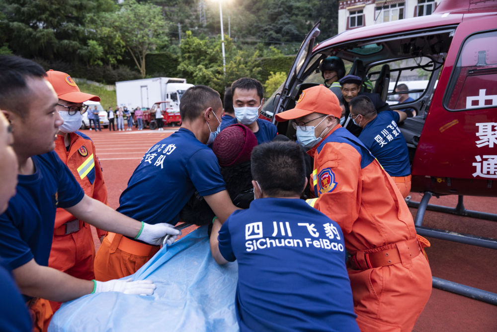 9月6日,救援人員抬著一名從灣東村疏散出來的受傷村民,準(zhǔn)備通過直升機(jī)將其運(yùn)出。
