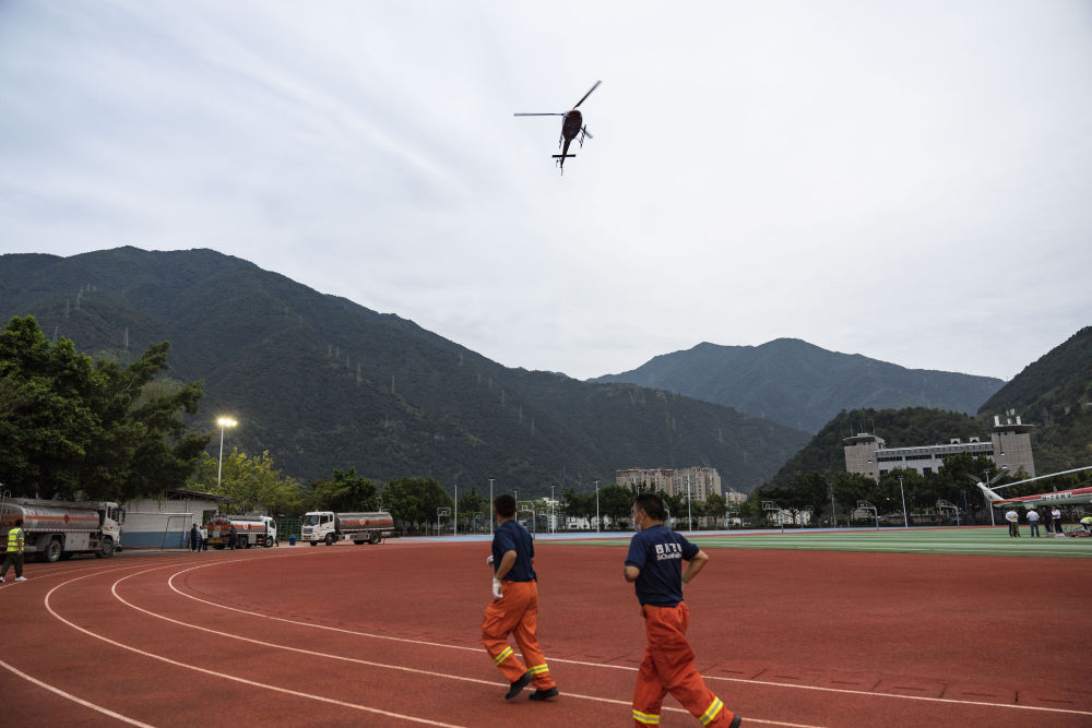 9月6日,在石棉縣中學(xué)的臨時起降點(diǎn),應(yīng)急管理部南方航空護(hù)林總站救援直升機(jī)在降落。